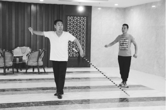 ▲刘如夺(左)为青年演员示范身段 (河北省石家庄市丝弦剧团供图)