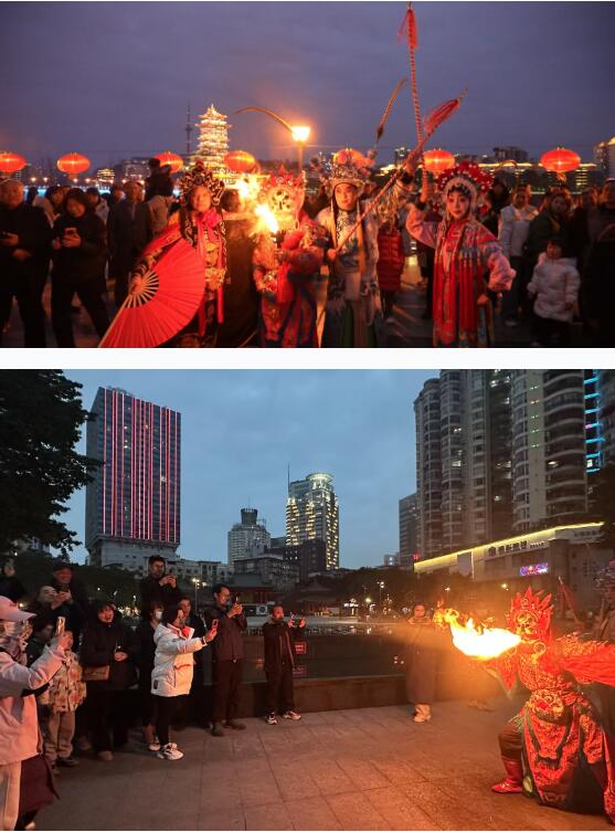 夜幕降临,非遗巡游演出开始了。戏曲演员们穿上戏服,走进广场,为市民和游客带来极具互动性的表演。大家围在一起,纷纷拿起手机拍照记录。