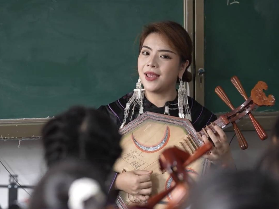 雷波县金沙镇中心校老师教学生弹奏月琴
